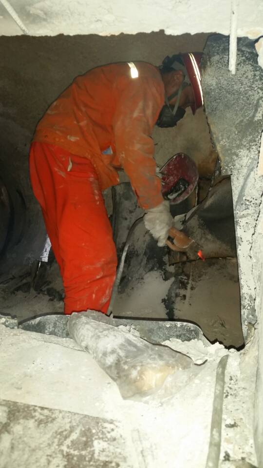 全廠沒有電源,意味著硅業(yè)收塵車間的引風機也停運,清灰工作就要在高溫且無負壓的條件下進行,煙道內(nèi)的溫度達到70多度,向外噴熱煙塵,加上澆注料的熱輻射,進入煙道立刻汗流浹背。此種作業(yè)環(huán)境,在員工心里和生理上都是一項巨大的挑戰(zhàn)。更具挑戰(zhàn)性的是5#鍋爐割除不銹鋼板的工作,煙道內(nèi)的電焊操作人員,需把不銹鋼板割成小于50cm的小塊,然后一塊一塊地從人孔門遞出。在此高溫環(huán)境下作業(yè),每個操作員只能堅持十幾分鐘,輪流上陣。長時間的焊割作業(yè),使每個人的面部都被烤的紅腫,疼痛。面對挑戰(zhàn),中材節(jié)能人沒有退縮,而是爭分奪秒奮勇作戰(zhàn)。換班的間隙,許多員工兄弟們累得背靠背都能入睡。在中材節(jié)能龍陵子公司員工努力下,持續(xù)作戰(zhàn)二十個小時,如期完成檢修,全力保障運營,展現(xiàn)了中材節(jié)能人的責任、力量與風采。